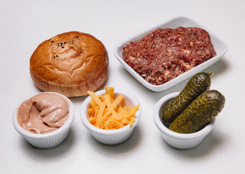 beef burger ingredients with raw minced meat pickles cucumber cheddar and sauce mixture