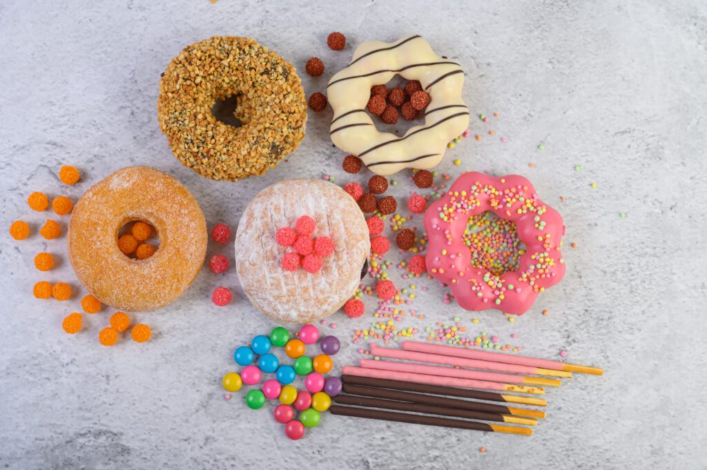 Donuts decorated icing and sprinkles on white background top view